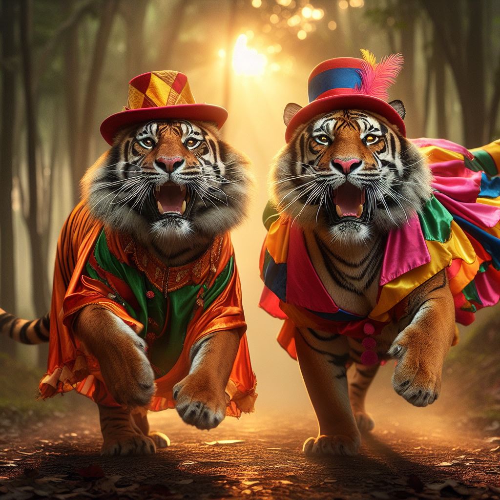 Mots : danse de deux tigres de Sumatra habillé en clown
